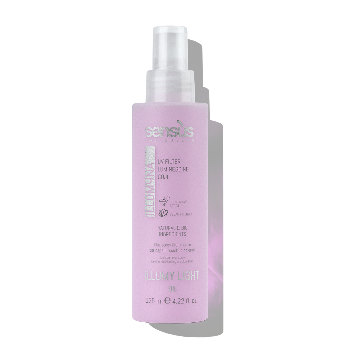 Rozświetlający spray Illumy Light Oil jest idealny do włosów matowych lub farbowanych. Wzbogacony o filtr UV i jagody goji. Gwarantuje ochronę, nadaje włosom połysku i przedłuża trwałość koloru. Produkt zawiera opatentowany przez Sens.Us składnik – Luminescine. Jest on pozyskiwany z kwiatów dziewanny, występującej na całym obszarze basenu Morza Śródziemnego. To czynnik aktywny pochłaniający promieniowanie UV. Przekształca promienie UV na nowe źródło światła, które rozświetla włosy.